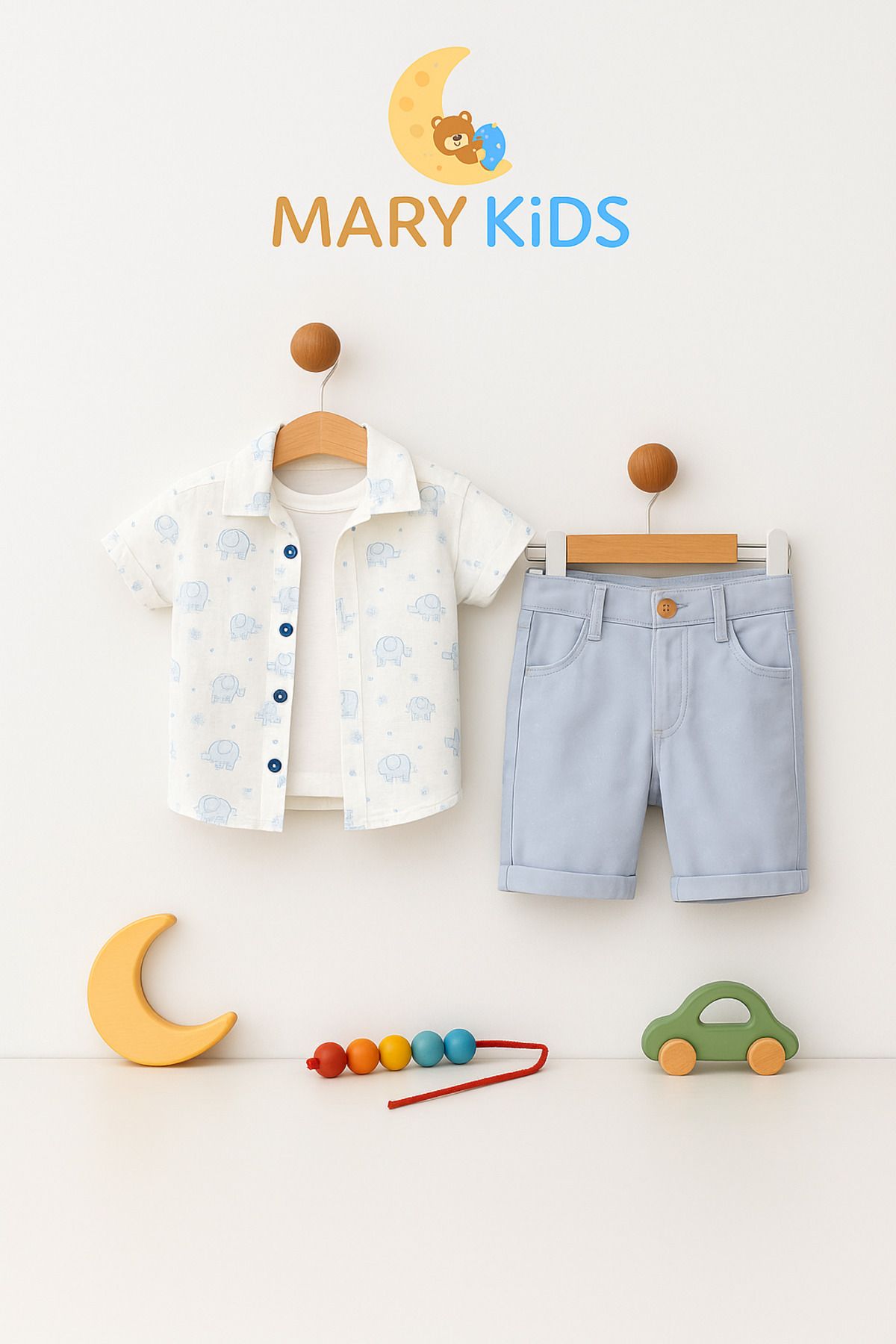 Erkek Çocuk Fil Desenli Gömlekli Tişört ve Şort 3’lü Yazlık Takım