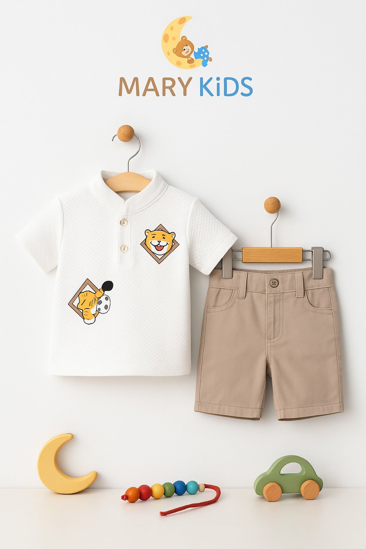 Erkek Çocuk Kaplan Figürlü Düğmeli Tişört ve Şort Takım