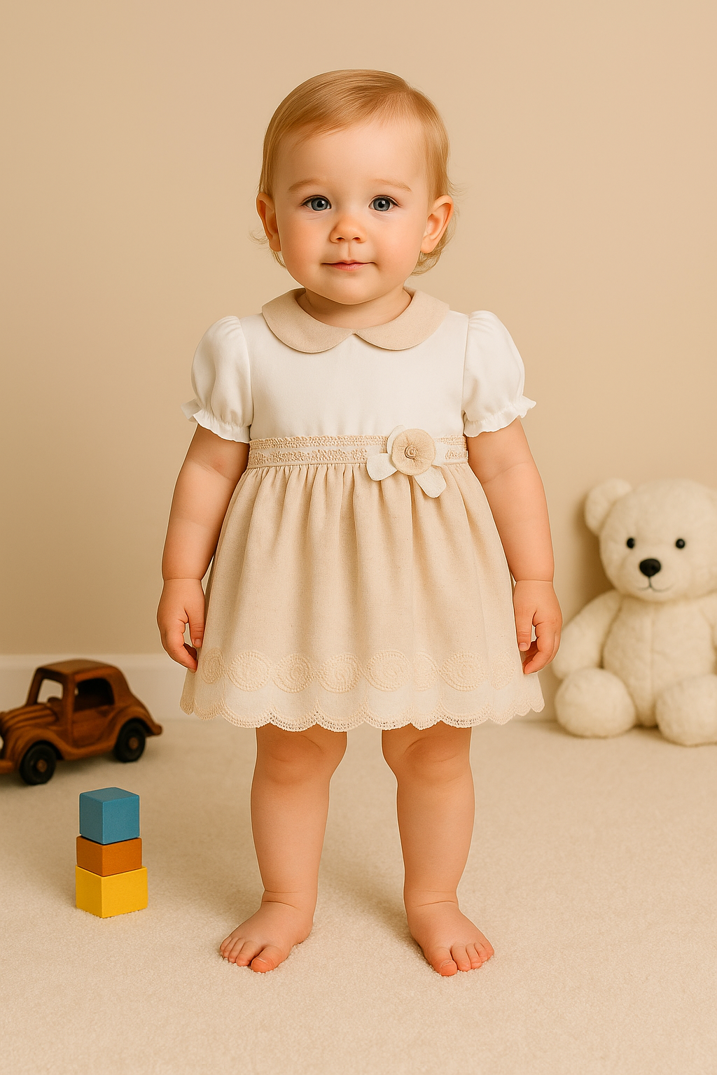 Kız Bebek Bebe Yaka Kısa Kollu Keten Görünümlü Özel Gün Elbisesi