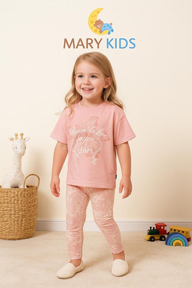 Kız Çocuk Baskılı Tişört ve Çiçek Desenli Tayt 2’li Yazlık Takım