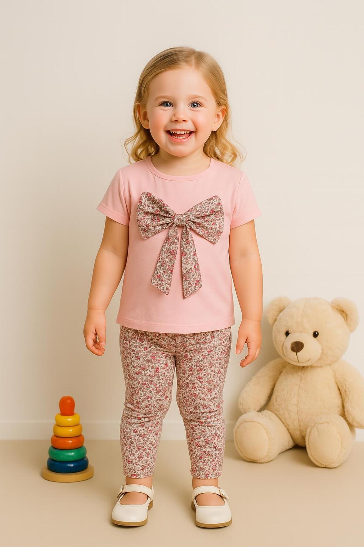 Kız Çocuk Çiçek Desenli Fiyonk Detaylı Tişört ve Tayt 2’li Takım