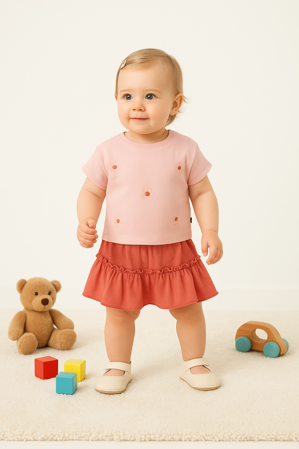 Kız Çocuk Çiçek Nakışlı Tişört ve Fırfırlı Etek 2’li Yazlık Takım