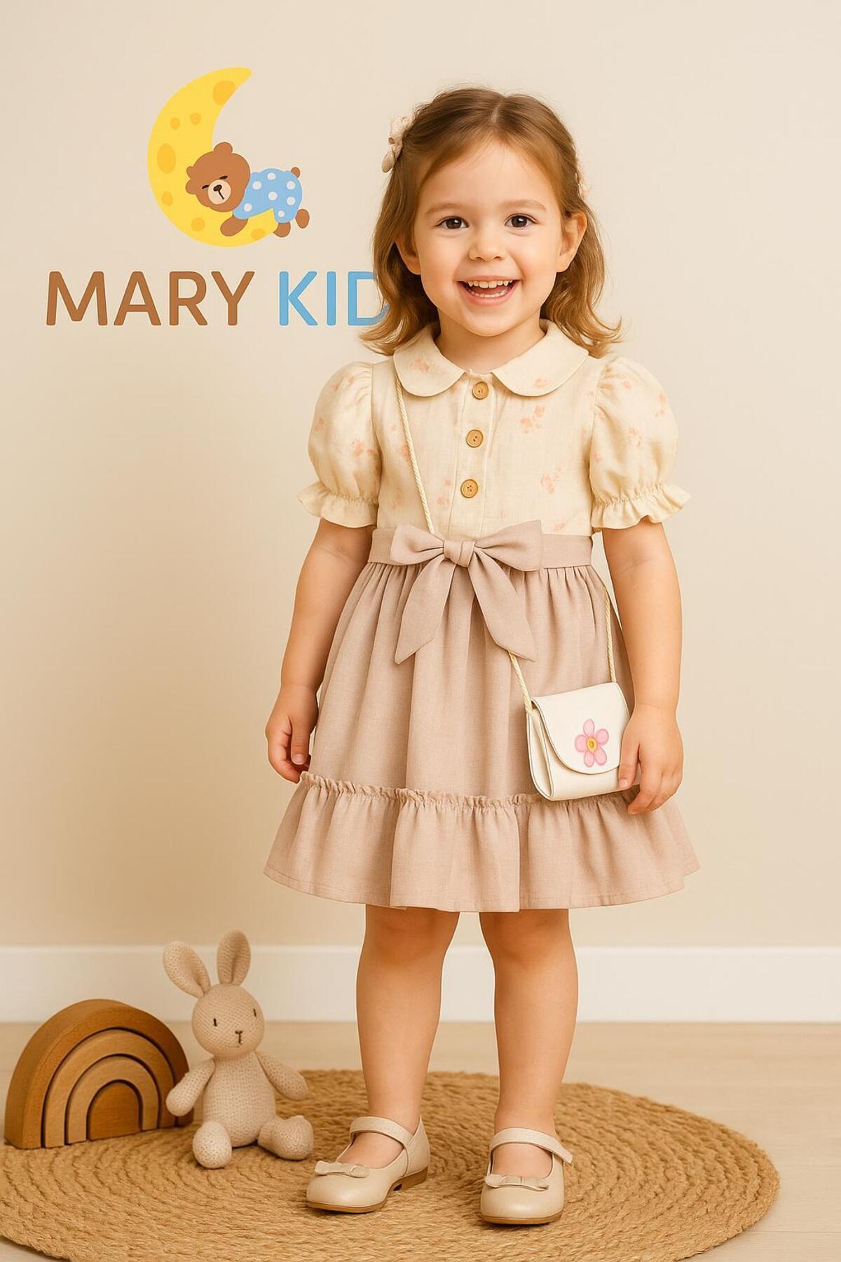 Kız Çocuk Fiyonklu Düğmeli Kısa Kollu Elbise Çanta Hediyeli