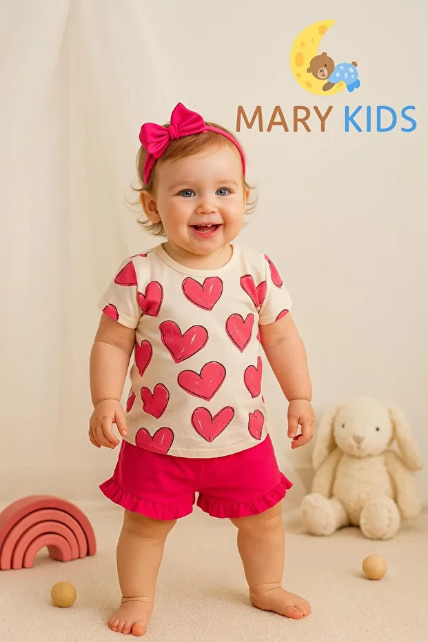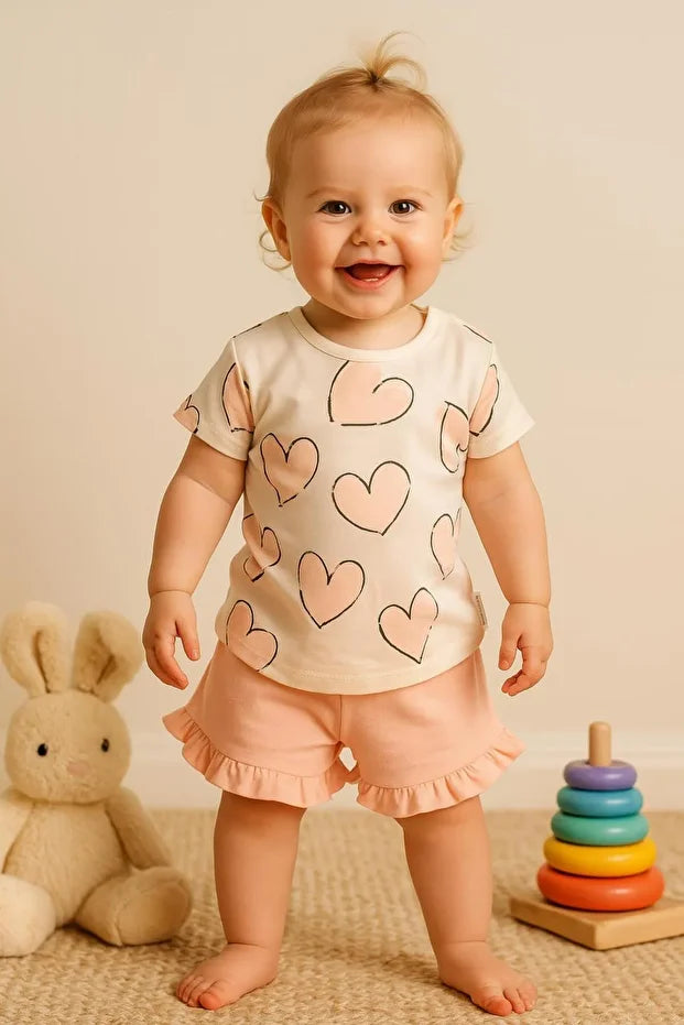 Kız Çocuk Kalp Baskılı Tişört ve Fırfırlı Şort 2’li Yazlık Takım
