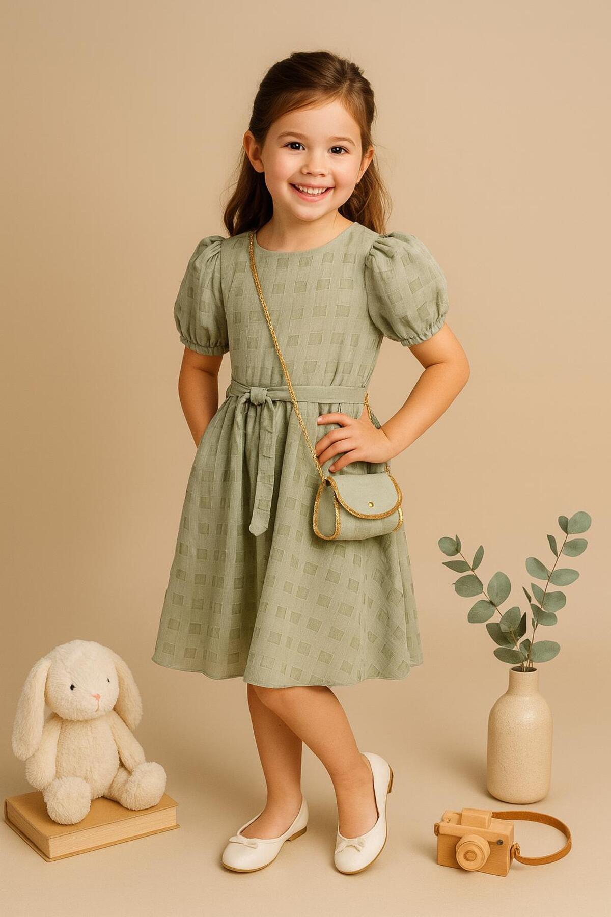Kız Çocuk Kemerli Kısa Kollu Yazlık Elbise Çanta Aksesuarlı