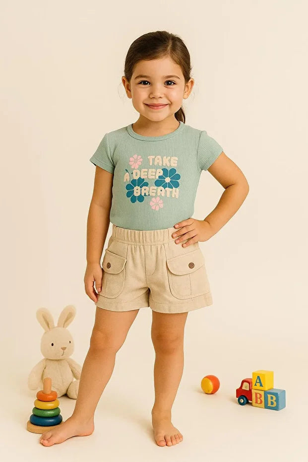 Kız Çocuk "Take A Deep Breath" Yazılı Ribanalı Tişört ve Cepli Şort 2'li Takım